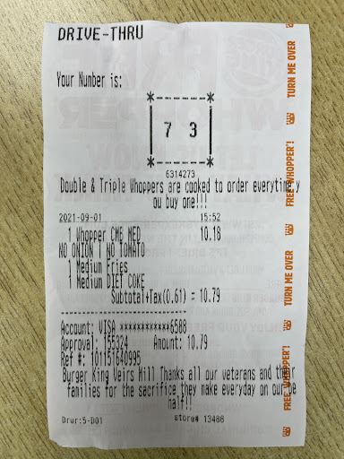 Read moreTell me why the drive through took literally 20 minutes and there were four cars in front of me. Then when I got my meal the burger was cold!!! You have to be absolutely kidding me that makes me so angry. I paid 7 dollars and waited 20 minutes for a cold burger!!!! Never again! That cold burger and wait I won't plan on returning to this Burger King and 7 dollars for a burger! I will not be coming back to a Burger King. There is a point where it isn't worth it. For the same price I can get 8 burgers from the store. I will not be investing in Burger King anymore. The Whooper cold wasn't even good and it was very dry. For a paying customer it is more than fair to ask for a hot/warm burger??? Then I looked in bag and there was no ketchup. I was not going to go back due to cold burger if had ketchup, but looked in bag and no ketchup. I go in and complain/request a new order maybe 1/10 of the times I have an issue. Hopefully they didn't spit in my food, because it had nothing to do with me. I just waited 15-20 minutes for a cold 7 dollar dry burger...