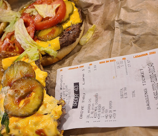 Second, the order appeared to be correct in the bag before I left, only to find out when I got home that my two double Whoppers both had single patties. See attached picture. To their credit the condiments were right this time. I included the receipt to show it was not a miscommunication; I was charged for the double Whoppers but only got singles.