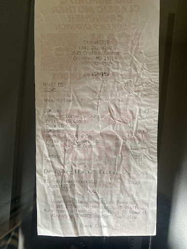 After having a couple of reasonable visits to the Crofton Checker's Drive-through restaurant, I had some very bad experiences. One burger I bought, the Mozarella Mushroom Burger, was so salty that it was inedible. It was accompanied by an order of french fries that were contaminated with pubic hair. I almost wonder if serving this lousy food was intentional.
