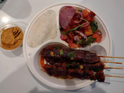 My order was the Pork Belly platter (See photo, the streaks on the dressing/sauce(?) paste cup on the left is from my taste-testing with a fork.). Please note the red oil under the skewers indicating it is a pretty spicy dish, which I love lots. The meat was very well marinated, and full of spices that many I cannot identify. The salad consists of higher end vegetables and red onion, with a dressing that is unusual and I have not identified yet but tasted salty with hot spice. The yellow brownish paste in the cup is the unknown factor. I am not sure what exactly it is yet. (Would appreciate it if the responder to this review would educate me please.) The taste is EXTREMELY salty (Think salty canned or bottled Chinese bean curd, usually packed like small cubes in those containers.0. I dipped the meat in the paste and tasted salty so unsure how exactly to eat it truthfully. The pork belly skewers are a work of art. They are grilled to perfect. There is not much fat on the pork belly (The incredible edible pig!). I would have preferred more fat as I believe that would further enhance the meat’s flavor, which was already excellent. The best part is that these meat skewers tasted very good even after reheating in the microwave. I accompanied the food with a cold Pepsi, and the sweetness of the drink countered a lot of the saltiness of the food. I should have bought a cold bottled herbal tea instead, which I believe would have complemented the meal more effectively.
