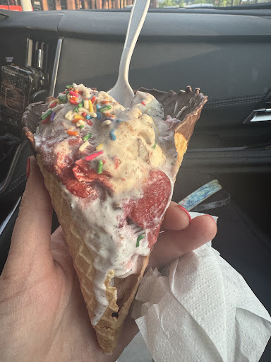 I have been recovering for surgery and unable to drive to go out for ice cream. I was so excited to finally go and have always enjoyed but had not been to In years. The girl who served me was a petite Latina. I asked how many scoops fit in a large sprinkle cone. She said it was based on size and could or would not tell me how many scoops fit per size. I asked if I could choose 2 different Sunday combos to put in my cone and was told I could not. When I requested the rainbow cone I saw when I walked in and had been waiting so long for, they said they just sold the last one. I settled for the chocolate dipped. The woman handed me my ice cream in the chocolate dipped cone inside of a cone shaped paper holder. I pulled the cone out do the paper holder and asked her why she gave me a damaged cone, She told me they were all like that.