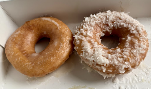 Fresh, hot, made in front of you donuts! You can customize them however you want or they have a big board of their own combinations. My favorites were the one with coconut and the chocolate glaze. When they first come out hot, it’s a little hard to eat they are almost too soft. If you wait a bit it’s more together. However if you wait till the next day, it’s pretty hard and not exactly good. A little too much glaze on everything - when they put them in the box, the sugar glaze pools in the bottom. When you try to take the donut off the cardboard box, it sticks and rips the bottom of the donut off. It even happened when the donuts hot and just came out. The day old donuts ended up being hard - they weren’t good by themselves but if dunked in coffee, it brought the life back to them. It was definitely only worth the try, if I was in the area again it’d probably get it again, maybe ask for light glaze? (Also I didn’t read the reviews before coming in- many mentioned cleanliness which really scared me. I didn’t go into the store myself so I cannot speak for that but I would take that into consideration and look around before if we go again. ) One thing to add. The day we went, Friday, they had buy one get one free which was...