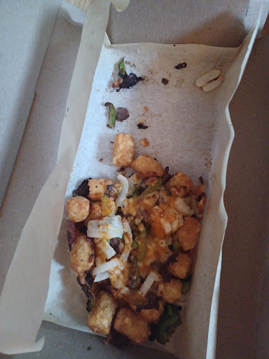 Read moreTonight we watched our order/delivery driver sit at Wawa parking lot till he had 2 mins to be here...this is what we received as a Philly Cheese Steak Loaded Tots! It literally looks like he chilled and ate half my husband's dinner! When he got here my husband asked him why it took so long...dude said he had another delivery?!? My husband was like How can you be driving when I watched you leave your store and pull in to another store and sat!!! On the 2 minutes mark you (driver/car) all the sudden started moving, and my stuff is cold I can feel no heat at all! The look on dudes face was priceless 👌 🤣 because he was busted! Good to know that the GM Kevin cares so much for his customer and their service, beings he didn't have time to take the compliant seriously, and sent his staff back to the phone to basically say oh well sorry for what happened, you want new food?!? Why would I want new food so the same driver can get the other half???? Come on businesses do better...