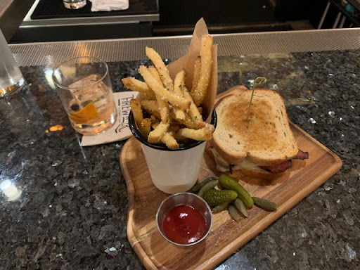 While the menu is not vast, there is something for everyone. We opted for an appetizer of the smoked salmon deviled eggs - nice little poppers that were a bit overshadowed by the raw onion garnish. Capers would have been a better choice, but that's just personal preference. The Cider-glazed salmon with asparagus almondine and garnish of apple and butternut squash was spot-on with well-balanced flavors. The star of the show (excluding the Old Fashioned) was the Pastrami sandwich. While I opted for the smaller portion of 8oz instead of 16oz, it was generously made with a nice balance of brown mustard to melted swiss cheese on fresh rye. The meat was very lean, something I was concerned about, and properly seasoned. Garnished with a side of parmesan fries, and little Gherkin pickles - suffice it to say, it did not last long.