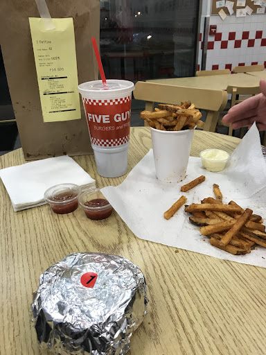 Read moreFive guys have superb burgers and fries... what can I say about that? If you're going to be eating woth more than one person then share a large fries (hand cut). The restaurant was mostly empty but thats not unsusual during the pandemic. I was immediately accosted by a young lady because I pulled my facemask down a bit in order to better see the menu. I considered her manner fairly rude until I noticed she was developmentally disabled. Kudos to 5 guys for providing a job for someone with special needs. She was in charge of sanitizing and cleaning and I soon saw how seriously she took her job, constantly cleaning everything (even the window sills outside in the heat). This is the cleanest fast food restaurant I've ever seen! The attendees were friendly and my order was quick and accurate. I was very satisfied...