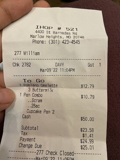 Read moreThis time my experience was totally different, the hostess or person that greet you and sit you at your table was young and a bad attitude, it was congested in the entryway so I left and went to IHOP on St. Barnabas Rd, Maryland once we arrive there it also was also wait but this establishment is a lot smaller in the entryway and also congested overflow with the takeout orders, but I waited outside until seated once seated our waitress took our order everything was prepared as order and enjoyed but when the time came for the check I was being overlooked by my waitress. She was going and serving the tables in front, behind plus across from me so I raised my hand and she still ignore until finally the manager came over and I asked him for the check my girlfriend left her a tip for her on the table which I said to her that I wouldn't left her a tip, at first I was off I didn't know what her problem was or if she had an issue with me but while I was walking to the cashier to pay it dawn on me, my girlfriend also gave the young lady who clear off and clean the tables she gave her also a tip and I b'lieve that the (waitress) didn't approve so my girlfriend went back and gave the young lady more. I paid for our meal and asked to talk with...