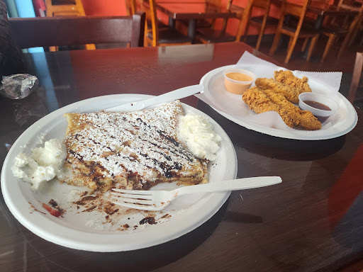 Read moreThis was my first time eating here & I was by far pleased w/ the food & service I received. I definitely felt a friendly presence while I was here. The food was amazing to my taste. I ordered chicken & waffles along w/ a strawberry banana, Nutella crepe. By far enjoyed what I had received. The waffle was made perfectly w/ a semi. Sweet taste & the chicken was absolutely stunning. Tasted as if it were made w/ a butter milk. Perfectly seasoned & not over seasoned in any way. It paired well with the spicy syrup, as well as the regular syrup. The Nutella crepe was very delicious as well & I would recommend it for kids w/ a scoop of ice cream. Made perfectly with the right amount of fruit & all. Every bite just was âMmhmm đâ From start to finish I loved the interaction & everything about the food. Paul was very welcoming & kind in the ordering process & Irina was very pleasant as well. Very graceful attitude, very welcoming, & thank you to them both for checking to make sure everything was well with the order. This is a family friendly place w/ family friendly vibes & Iâll definitely be returning...