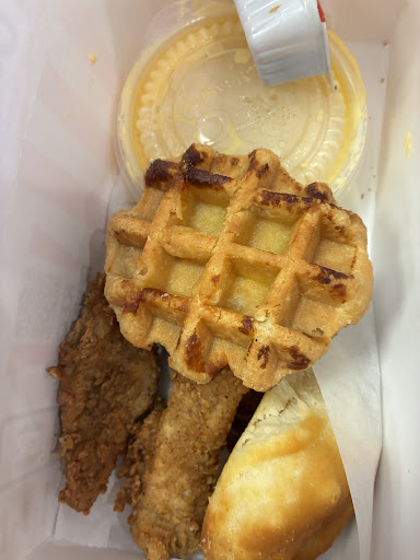 Eventually, I tried the door again and it opened. I went inside and spoke to the manager. I explained the situation, including the bad tea, and asked again for a bottle of water. He didn’t offer any kind of solution and was dismissive. When I finally received my meal, the waffle was burnt, and the chicken tenders were clearly old and dry. I’ve worked in food service for 15 years — I know the difference between fresh and reheated or sitting-too-long chicken.