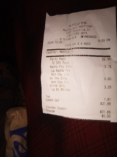 Read moreI got the party pack and they did not give me the 6 Doritos locos and gave me the soft tacos. All soft tacos, the gave me bottom of the barrel nacho fries, they didn't put my food I ordered into the takeout bag. I had to manually do it myself. The cashier couldn't understand the menu but confirmed my order by price. The cashier didn't relinquish the large cup until I paid completed by Machine pos. I paid by credit card so I doubt I will get a refund or return to this location that is not available on the app to order from. This is a half kfc half taco bell with bottom of the barrel workers that shows favoritism to customers as everyone else had their meals in their...