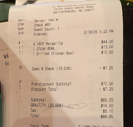 Came here last night food was great.. service was terrible. We waited to be seated because there were 3 tables that had not been cleaned. Once seated we waited another 20 mins for our order to be taken. Once our order was placed I wanted to add queso dip. One server told me she would get our waitress and she walked past me 3 or 4 times before she asked me did our waitress come out I told her no. More waiting and our food finally came I asked for black beans and the order I placed was for dos tacos. She brought out refried beans and flower tortillas. On the menu it says it comes with corn tortillas. I asked the waitress because I knew what they brought out was flower tortillas. She tells me they are corn tortillas. She leaves comes back I tell her I asked for black beans and that they gave me the wrong tortillas and proceeded to argue with me saying that they are corn tortillas. She takes it back comes back out with the correct tortillas and tells me I needed to ask for soft tortillas in order to get corn tortillas or else they would be fried. She even pulled the menu back out to prove I was wrong. She was even shocked to see it said corn tortillas. Then she said well the kitchen is different, not really sure what that means. I told her that frying corn tortillas does not magically turn them into corn but I didn’t want to continue arguing I just wasn’t going to tip. We get the bill and 20% gratuity is already added. For bringing out the incorrect order after waiting an hour and arguing with me about it, she received a 20%...