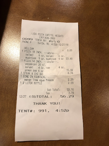 Ā Ā Ā Read morePeople DO NOT eat at this establishment. We must come together as a people and close these type of establishments down. The manager (a male) is rude and not knowledgeable at all. The process/protocol for this establishment and Iām assuming other Ledos is to pay before you receive your food. If you donāt pay then the PAID ticket/receipt doesnāt go to the kitchen and you donāt get your food. Well once my food was up and he looked at the ticket and called my name this manager decides to ask me ādid I payā... Iām first surprised then angry. I dare you!!! Ask me this. My response was and the expression on my face was to repeat what he had just ask me back to him .. Then he refuse to give me my pizza!! I proceeded to take my pizza and ask him was this not the process ... to PAY first BEFORE you receive your food!!! He said he was just asking. My question is why? Why? single me out ... why would you ask any customer this if your policy is to have them pay first!!! Before any food item is made and handed off to the manager. We need to start holding establishments responsible and withholding our monies with these places for the lack of respect and lack of knowledge coming from their employees. I will definitely be calling corporate on Monday for the Capitol Heights...