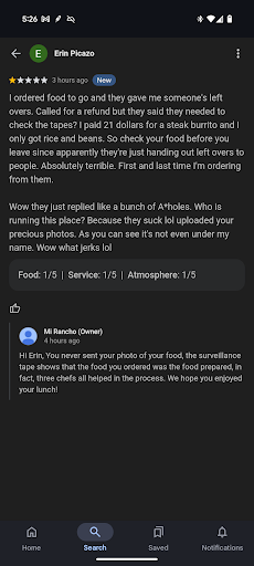 Read moreThis place does not even deserve one star! I went there today with my sister for happy hour. We ordered a pitcher of melon margarita which was awful!!!! It tasted like syrup. We moved on to sangrias for some hopeful redemption. In the meantime they had complementary chips and salsa. We placed our food order and I also ordered guacamole to come out as an appetizer. The guacamole was not fresh! It was so creamy and tasted pre-made as from a package and not made in house fresh. The only chunks in it were tuns of chopped onions and tomatoes. I asked the waiter if it was made fresh and what were the ingredients. Something in my two bites of it was immediately not agreeing with me. The waiter asked if I liked it. I said no and he said no problem and took it away. Great problem somewhat solved. So then a manager, who proclaimed to be the owner comes over angrily with the guacamole and say I insulted him! Jose Alvarez owner of Mi Rancho Silver Spring, MD. I replied that I should be insulted. Not only was the guacamole not fresh or good. As an owner instead of having a dialogue or trying to make things right you yell and be-raid me in the middle of the restaurant as I'm sitting down to still enjoy my time there. Never will I go here again or recommend such an establishment that does not value good customer service nor good or well prepared food and drinks. Then they had the nerve to send out another bowl of guacamole. If the first bowl was so good and made right why would you send out another bowl?! I told the waiter never have I had such an experience. I had him cancel our entire pending order and we paid our tab and left. The owner continued to approach me ans argue to defend himself. Offering to show me receipts of purchasing fresh avocados. It was very bizarre. I still feel very sick...
