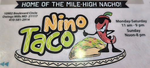 Yesterday was my very first visit to this eatery and will be my very LAST time I ever eat from Nino Taco (Owings Mills). I love Mexican meals however, I never had such horrible Mexican dishes in my life...very distasteful :( My sons and I spent $48.00 on dinner. So overpriced for such horrible food. No worries Taco Bell. Their Mile High Nachos...NOT SO HOT AT ALL (burnt nachos, over cooked dried meat, most of the cheese dried out and stuck to sides of aluminum foil dish. Tostada was burnt with over cooked, dried out meat.. tasteless! Tacos were dried out with over cooked meat again and very little toppings. Salad... mmmm well, lets just say I could have shredded my own head of lettuce and sprinkled little salsa and 1/2 tsp of sour cream on the top. To top it all off when I went to the counter to get utensils, the Cashier was also the worker preparing the meals for every last customer that came through that door between 5pm & 7pm. She run water on her hands for few seconds then dry them on towel and proceed to prepare foods without gloves. Can I say ...I was "CRINGING"! Really Nino Taco???? MUST DO...