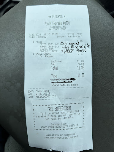 Read moreWishhhh i can give them 0 star. I always go there to buy some honey walnut shrimp. First the order taker he was very very rude i never talk this kind of person. I asked for walnut shrimp. He ask me 3 4 times for what i want to get. I explain him that what i want. I ordered small size shrimp which i always get with my 3 entries plate . He didnt tell me my total just said pull up the window. I thought it must be $2 i always pay for my shrimp but guess what he asked me $5.30. When i saw my food i got shock. It is same like McDonald small size french fries bag. I tell hum nicely This is very small quantity for the amount i paid he said this is what you can get only. Seriously man only this for $6. I said take it back i dint want it and he refused me. I said again and again when he keep refusing me i asked for manager and he said i am the manager. Wowwwwww seriously thats how panda express trained their managers. If manager is rude you can imagine other employees. He just spoiled my day and im not gonna come back. He dont even guve me my receipt so i can check price. I guess he is stealing money. Manager name is scott. Please give him training again may be this time he will learn some manner to talk with customers. I think he dont know management skills. Manager responsibility is to manage every situation not make the situation worse. Please pleas please dont steal people money they are also working very hard. My heart is crying. I really want to enjoy honey walnut shrimp because i was craving for them but unfortunately i didnt enjoyed all credit goes to Mr. Scott 𤎠I hope his owner will take some action because if he will lose customer It gonna hurt his business not his employees Thanks...