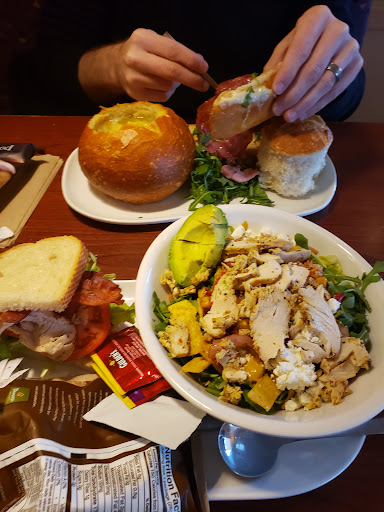 Had a very UNsatisfactory visit to this restaurant today. In fact, the ONLY positive about my visit was the girl who took my order. Her name was Casey. I'd give her 5 stars.. but only her. She was welcoming, friendly, and quick. After ordering, we made our way to the pick up counter. Got our drinks and waited. I found the employees behind the counter who were putting food together to be very task oriented, and not so much customer oriented. They didn't really seem aware of anyone else there, nor did they seem to care. One employee in particular, Sarah, I found to be especially rude. I know the restaurant was busy, but she was at times throwing the dishes up on and across the counter, often making the baguettes slide off the plates (and of course she didn't notice -or didn't care). At one time, a supervisor had to tell the employees to replace one of the baguettes that was half off of the plate, and resting on the counter - due to Sarah's aggressive toss of the platter. WASTEFUL. So I get our food and go to our table. I ordered a bowl of soup and 1/2 a panini. Upon beginning to eat, I found my panini to not only be on the cold side, but one side of the bred was SOGGY. Ugh. I walked back up to the counter and had to "excuse me" twice before anyone would look at me. Sarah did. I asked her if she could remake my panini, as it was soggy (and showed her the sandwich). She looked less than thrilled. NO "I'm so sorry, let me remake that for you.. just a minute".. nope.. the response I got was a look as if I was crazy, and "Well could you throw that away mam, because I can't." Ok.... so I throw it away, THINKING she was going to have another one made right away.. one would assume, right? NOPE! I stood there AT LEAST 5 minutes, waiting for a new sandwich to be made. I saw many other orders going out.. fast.. however, not my REPLACEMENT. Finally, after just being totally irritated, I speak up and ask, "Are you remaking my sandwich?" As this question, Sarah looks at me with a totally puzzled look on her face. She has COMPLETELY forgotten. I had to remind her about her telling me to throw it away... Ahh.. the lightbulb goes on.. I make a comment that obviously my satisfaction was not a priority to them.. and at that point another worker apologizes to me (in a rush, not even giving me eye contact) and quickly says they are very busy.. yeah.. I get that. My time is valuable too. So Sarah goes to redo my sandwich. When it finally is done, she plates it and puts it on the counter.. not even acknowledging to me that it's mine and ready.. no apology from her for making me wait even longer.. nope.. nothing. Another worker has to tell me it's mine.