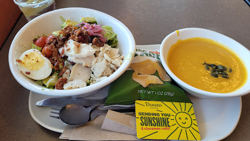 Brand new store, clean, great parking, and the food was good. This was my first visit there. I could tell the staff were a bit new and not as well trained as other stores. One was reading their cell phone getting a drink while blocking the area from customers. The real issue is when we ordered, we had a gift card and it didn't work, and nobody including the manager could help. We even had to show them how to swipe the card through their own reader, but it still did not work. They had no idea how to resolve the issue, and just said call "the number" and talk to "them", like it is a different company. Entering the number manually caused the same problem. We then had to enter the long number manually a second time to even find the help number to call. After 10 minutes on the phone and hearing Panera is having more calls than usual, a menu tree, and two phone transfers, it still did not work. We ended up just buying the meal due to the hassle.