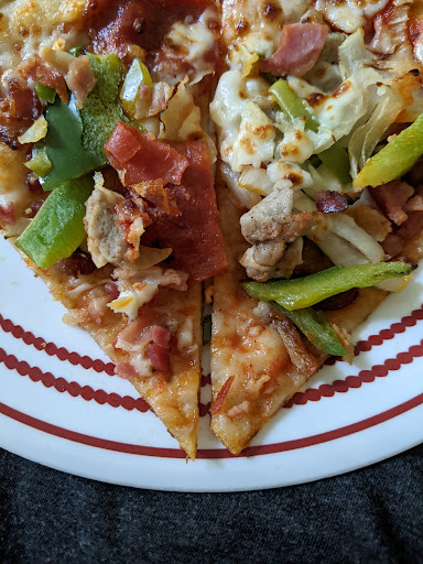 Read moreFood and service were not good today and this time, it was bad enough to cause them to lose our business. I spent $60 on pizzas and breadsticks for my son's birthday and none of it was good. The crust was so tough we could barely saw through it, even with sharp steak knives. The pepperoni pizza had maybe 7 pepperonis on the entire thing, while the chicken/veg was so piled with toppings that's really all it was. It was comical; the slices were impossible to pick up and eat, and the flavor was poor and completely unbalanced. The cheese was minimal and mixed in with the mounds of toppings, so it wasn't possible to remove some of the overabundance of vegetables and meat. When we tried, we were left with nothing but tough crust, as the sauce was barely detectable. So poorly made! All 3 of the pizzas were basically uncut. There were only slight (and very uneven) indentations in the top of the cheese, and because the crust was so ridiculously tough, it was time consuming and difficult to cut. Lastly, my 80 year old father stopped in to pick up the food for me, and the employees ignored him for several minutes. It wasn't until an older worker (possibly a manager) appeared that he was acknowledged and helped. I feel it was all a complete waste of money and I will avoid this location...