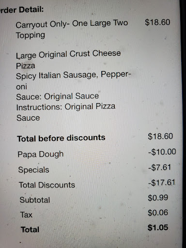 Read moreI had to go to dominos to get my refund since they took 3 hours just to "start" making my pizza. We pulled up to papa John's and the doors were locked at that moment the delivery guy pulled up as well. I proceed to ask if they were open and he said yes for delivery only which I was fine with (yes this is a long review just listen to my wattpad story okay) I asked him how fast I would get my food and explained my dominos dilemma. He said 30 mins and I said "you promise?🥺" and he said "I would deliver it in 20 mins if I could" and smiled, and at that moment I gave him all my trust.. then he gave me hope and told me he would hand deliver my order to my car. And my stomach fluttered I knew he was a real one. He told me to order online and remembered my address. And everything went down hill..their website said carry out only, which didn't make sense because it also said delivery only before clicking the site.. so i proceeded anyways and as I was about to click confirm order my heart broke... "this store is closed" is what I read.. but how..how could the store be closed if I'm looking at them in my rear view... I lost a part of myself at this point so I tried to call...and it rang.. and kept ringing.. and nobody answered my hungering cries.. a promise was broken..a soul betrayed...a heart shattered.. and my stomach still empty... I guess I'll go...