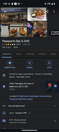 Ā Ā Ā Read moreWhen I went to passports bar &grill inside the BWI airport I had been there all day with my 3 year old and only had about 30 bucks left for me and my kiddo our plane to leave at 9 ended up leaving much much later almost 1 am I didn't leave a tip on the receipt because I didn't have the money to spare for travel expenses (I am a stay at home father while my wife follows her dream if being in the military) and I believe that Jazmine H who took my order by the bar (where you place said order) after I left added a dollar under the tip area which when I finally made it to Germany put me in the negatives as I had to buy me and my daughter drinks and snacks at almost 11 pm. The food was good but the server was terrible, I contacted the airport authorities they said call the resteraunt they don't even have a phone number! So this is my way of calling out the server. If the owner wants to reach out to me do it via this review I have a copy of the receipt and screenshots of the statements from my card to prove that I did not...