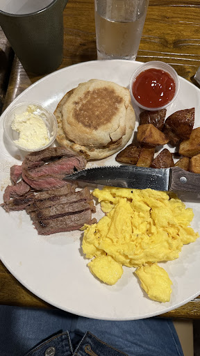 Food took a long time to arrive. It was at least 45 minutes to get our food. And when it arrived, it was cold. Everything. Everyone’s. Grilled cheese sandwich was 30 seconds short of burnt. French toast was soggy. Eggs tasted & smelt strange. All the food was flavorless (the salt shaker was very popular at the table this morning). And the 10 oz breakfast steaks were maybe only 3 oz and already cut up for us like a kid’s meal.