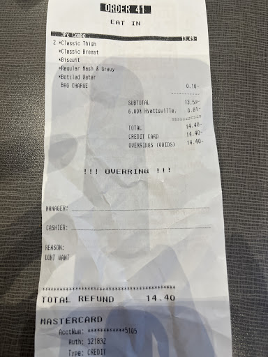 Read moreI was just there today 20mins ago and when I came in one of the employees sitting in the front on the phone talking loud and getting off some kinda nasty on her phone. There’s a long line of people there were only two at the counter serving and taking orders. No smiles 🙄😐😶. I asked for the nine piece for $20 and chicken tenders with small side. Now I already waited along time to get to the counter now I got wait even longer cause the chicken was not and will not be ready for three mins. I saw my food sit there open waiting for the chicken to be ready. The young lady asked do I want dipping sauce I said yes. But what I noticed was a meal that should have cost me no more than $30 dollars cost me $40 and the bowls for the large side whe in small bowls and the one large bowl was haft filled. The young lady charged me for a 12 piece instead of what I ordered and there was no spoons, no dipping sauces,no jelly, just napkins. The cook was slamming the chicken down in bins. The young lady took two orders and never came back to me with my food until she was done with the two people behind me. I have been coming to this place for years and I have watched it go down the drain. The staff keeps changing and my food is always jacked. Last time I was there the manager was taking my order and the whole was wrong. I had returned three times just to get the Manager to do it right my sweet tea had no sugar in it and my food was someone else’s food. The manager is a older woman who cannot keep up and the young staff needs to be either changed or trained otherwise I will not be coming to this location ever again it’s nothing like the one on...