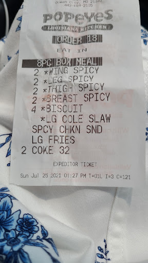 It's about 9:30pm in OC MD. I'm a local and although I love lots of the local flavors, most places around here close at like 8 or 9. My daughter and I were really hungry and was on our way to a well known Mexican grill chain in west o. "Closed".. next door at the west-o chicken sandwich place that has pretty good food, had an all to familiar 40 car line to get in.. no thanks. I thought let's try Popeyes the new chicken sandwich sounded pretty good but I hadn't had it yet and ordered extra food in case.. Sorry for the long message to basically say "Dang"! Little to no line, food was hot, came out relatively quick, the guy at the window seemed to be having a good time (at work) and the price was a really good value. I'm not one to always leave a review on every decent experience I have and I'm sure after this one, Google will be prodding me for more reviews on the last 20 places I've been today (annoying) but that's ok. I really just wanted to say thank you Popeyes for exceeding my expectations and making a late night hangry dad very happy. đđ Two thumbs up! Oh and the chicken sandwich was twice the size of the competition for around the same price . The commercial seemed a bit like BS but, it was, really good! Enjoy, I will...
