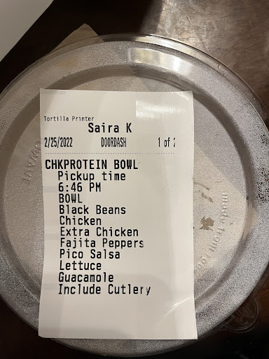 Update** I’m home now and I didn't ask for extra tomatoes and now I realized after telling the girl twice, she still put 0 tomatoes so now all I have is rice beans fajitas and corn...pictures for proof! Get a manager in...