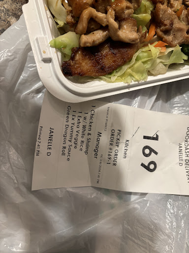 The sushi is simple and quick to make, and the food is hot and tastes like standard hibachi takeout. Food is done within 10-15 minutes of a DoorDash order. The interior I personally wouldn’t eat in, but I also don’t walk into Chinese takeout places and eat at their two or three tables lol who even does that?
