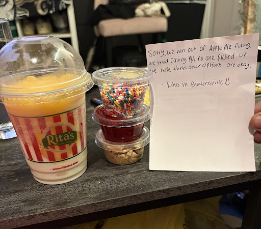 Read moreWe went to Rita's and purchased 5 items. One was an Italian ice and I have never had an Italian ice with fruit in it at Rita's. It was for someone in my family. He didn't know nor wanted it after eating it and finding out that fruit was in it. He was surprised fruit was in it. After asking the cashier a young girl that made everything to change it she said it was already made so she couldn't change it. We then asked for a discount if we purchased another Italian ice without fruit and she said they didn't give discounts. I guess they also don't try to solve nor address customer's issues either. We won't support this...