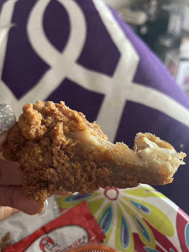 Food was actually good. Got the regular chicken sandwich with fries, and catfish/wings with fries. Chicken sandwich was honestly like Popeyes. Bun was very slightly sweet and the chicken has a great coating that stays together and is flavorful. Sauce was also almost exactly...