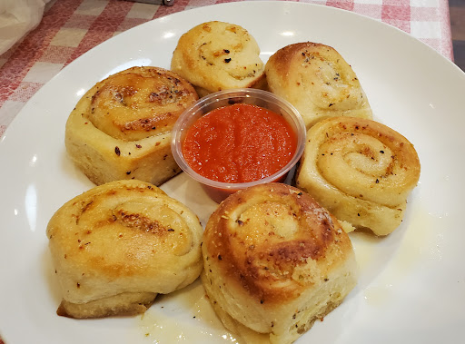 You order at the counter after walking through a glass lined kitchen looking at all the pizza choices. Once you get to the end ,you typically know what your mouth is watering for. You order at the register, they give you a number and you choose a table. Someone comes out, greets you again and sets your table. A few minutes later someone comes out with your food. The pizza is great, close to NY style slices. The calzones and chicken wings and tasty. The spaghetti and tomato sauce is delicious and we always have plenty to take home. We only wish they would give you more than one piece of that savory garlic bread.