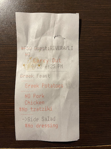 This is the second time they mess my order up, I specifically repeat myself that I do not want the tzatziki sauce and when I arrive at my hotel room and get ready to eat, guess what? Tzatziki sauce in my gyro!!!!