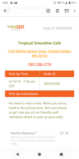 Ā Ā Ā Read moreNot my favorite Tropical Smoothie! I'll stick to Bowie location! They are entirely too slow at this location.