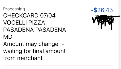 Read moreI’m a 72 yr old senior citizen on a very low income. I placed an online order on vocelli’s app yesterday, Sunday, July 4th 2021. I never received a confirmation or email stating you received my order. I went on line and looked at my Bank Account. Sure enough, the $26.45 was deducted from my account. The only way the bank would have deducted the $26.45 was the store had to send the transaction to them. They didn’t pull it out of thin air. I called the store and told them I HAVE BEEN CHARGED for the order, but received no email, text, etc. They said to take it up with my bank. It was Sunday, banks aren’t open again until Tuesday. Since I received no food, which I ordered to last me for four days, at that point I didn’t have the money to re-order or to go somewhere else, I had to do without. You can see by the attached I was indeed charged. It’s not like I’m a new customer. I order all the time. But, this will be my last. $26.45 may not be a lot of money to your store, but being on only Social Security it a whole lot to me. It upset me and angered me to the point I cursed your worker. That’s not my personality at all. It’s a shame, I loved your bacon pizza.