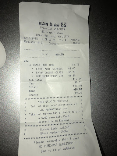 Read moreSubs and sandwiches have gone down hill. Gas prices aren’t such a good price, can get cheaper at Carrolls about 1/4 mile north of Wawa on 301.