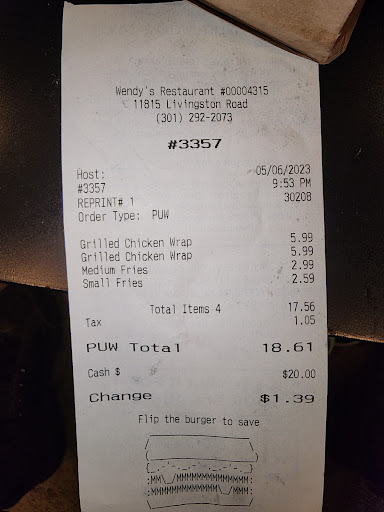 Read moreWhen is the manager and regional manager of this Wendy's going to wake up and do something of the very poor service and dining area as reported in so many reviews? This is the second time in the past two months that we tried to have a simple order filled in less than 25 minutes. And this is with two other customers in the place who waited over 15 minutess for the attendant to acknowledge them and take their order! I travel all over the northeast area and frequent many Wendy's for their frostys. This one in Ft Washington is the worst. No customer service, noncharacter workers who have no sense of urgency. The workers act like they do not even want to be there . Well maybe a manager should start with the long hair freaky guy at the counter and have him taking out the trash and cleaning the dining area to see what you get out of him cause as of right now in my opinion he is worthless. And this is the second time we had such a slow and undesirable service at this place. And these are the people that want more money than minimum pay. Well if you do minimal work and no customer service minimum wage is too much for them! This is it for my business in this Wendys. I will not return and will encourage friends and neighbors to avoid this place.May more people in the reviews speak again of the poor service and I would hope this place is gone. The people in this area deserve better service with people who appear to like their job other than the ones at this Wendy's who are a disgrace to the Wendy's...