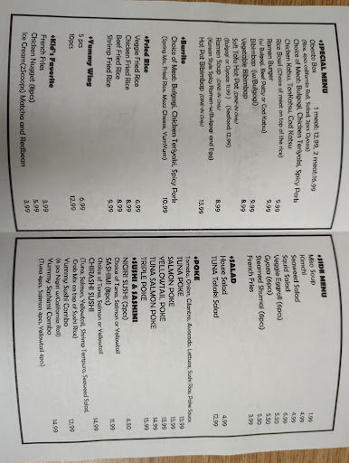 Read moreOrdered nigiri sushi with Yellowtail and the vegetable fried rice. 2 pieces of Nigiri was $4.50. I returned to my workplace and happily took a bite of the plain-looking Nigiri to find wasabi in between the layers. I have been eating sushi for years, and at countless sushi bars; I have even eaten at a hidden sushi bar in New York city, and I have never experienced this. It was not in the menu that the Nigiri comes with wasabi, and upon calling the restaurant and speaking directly with the sushi chef myself, I was told that "every sushi bar does that" and "wasabi is the glue". This is not true. I do not eat wasabi, so I was quite displeased and worried for those with allergies or sensitivities in the future. Some people cannot consume spicy foods, and it is not explained anywhere in the menu that this is on the fish. My fried rice was also quite bland, although freshly prepared just as the fish was. I politely ended our conversation, but I won't be returning here or recommending it in the future. Again, if you're looking for plain, freshly prepared food, they have that down, but I was very disappointed with my Nigiri and fried rice. The bulgogi my coworker ordered was enjoyed, but the fries we ordered were also not very good; although the texture was nice, they tasted as though they were cooked in the same fryer as the other food, so not as clean of a flavor. All in all, it was not the flavorful experience I expected from the name, and while the new location is clean and well kept, the menu needs to be more specific so that people can make...
