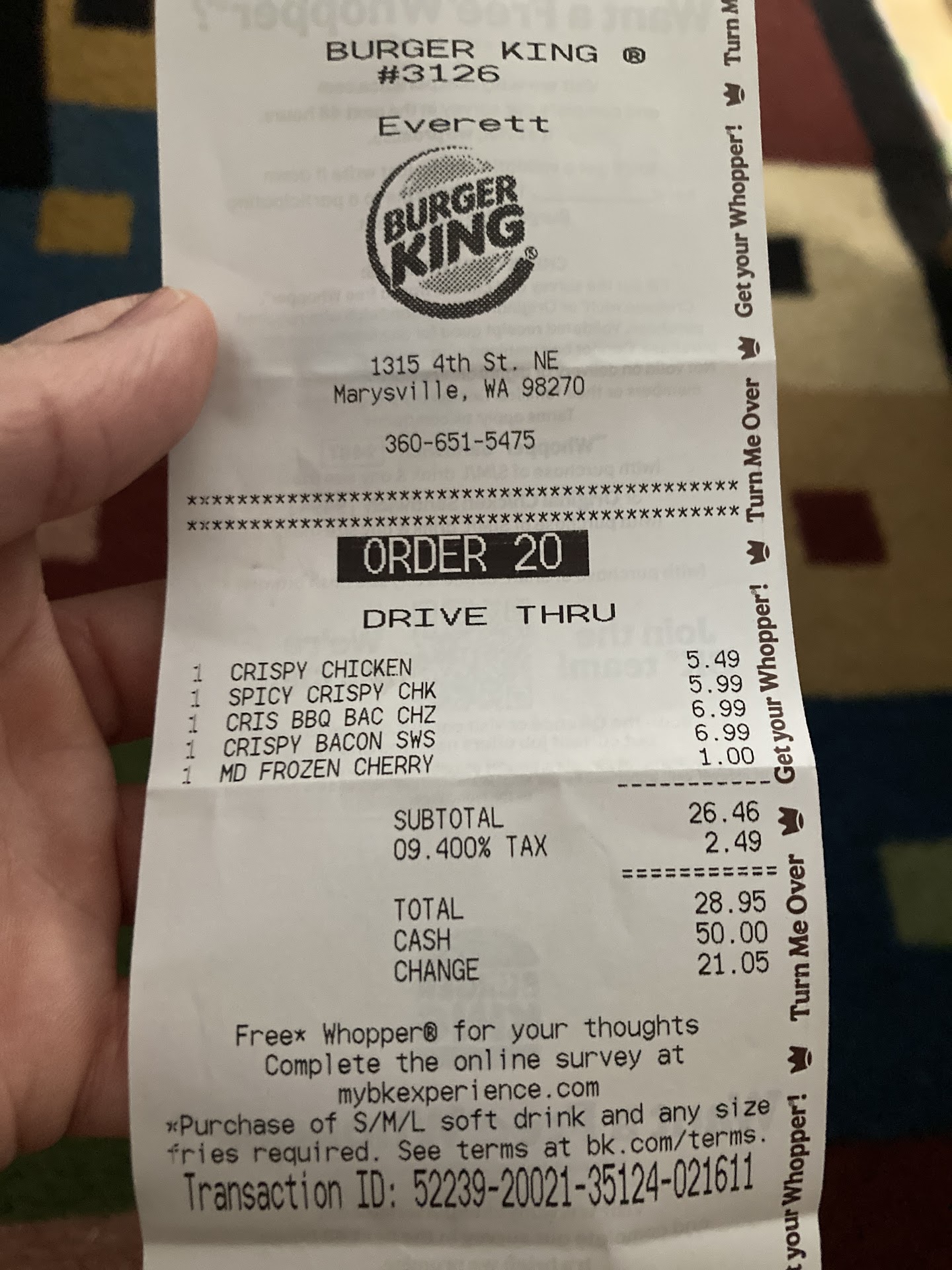 Read moreNot sure what it is but I used to love getting Whoppers. Now it's been always at this Marysville location and I no longer like them. They don't taste as good and in most cases, I get the hard stem parts of lettuce and large, unsightly pieces of onion, not the nice crispy leaves of the lettuce and not nice round sliced onion. Usually a sign of poor management from someone just showing up for the paycheck. Such a shame with so much competition so close by. Just an addition. My daughter stopped here and picked me up a whopper and fries. If she asked me first, I would have said no thanks. But since she did, I had hope for something to change my initial review of this location. They are consistent that's for sure. Another hockey puck burger topped with an unmelted piece of cheese, small pieces of lettuce stem, a huge piece of onion and an end piece of tomatoe. Add an unbalanced layering and the condiments are a sloppy mess. I couldn't help but bust out laughing. It's incredible how consistently the poor quality is at this location.