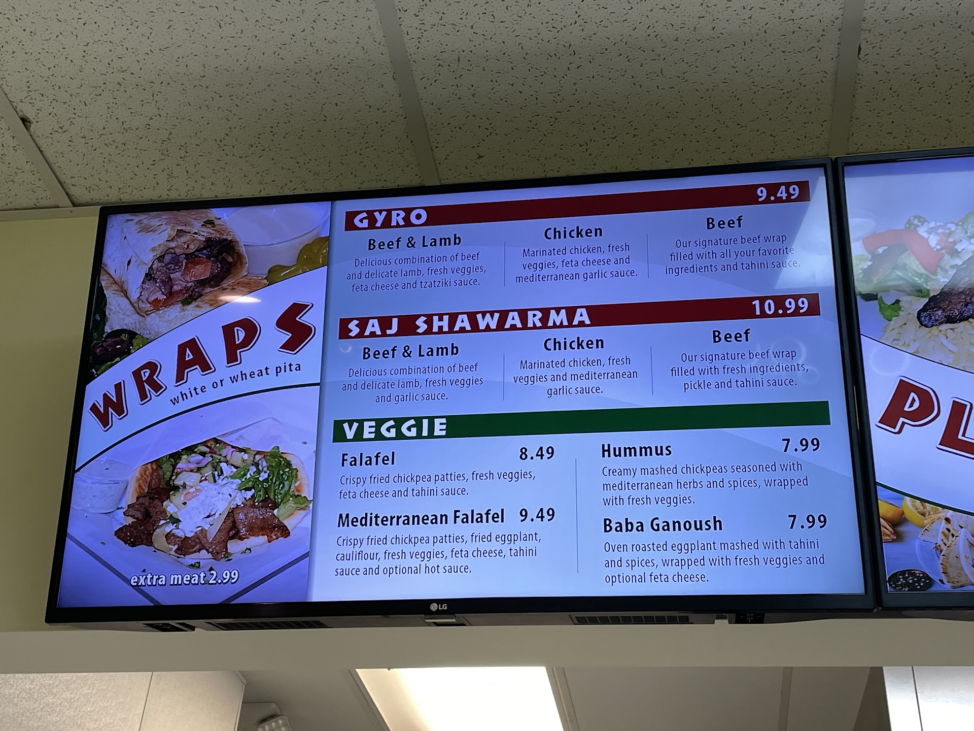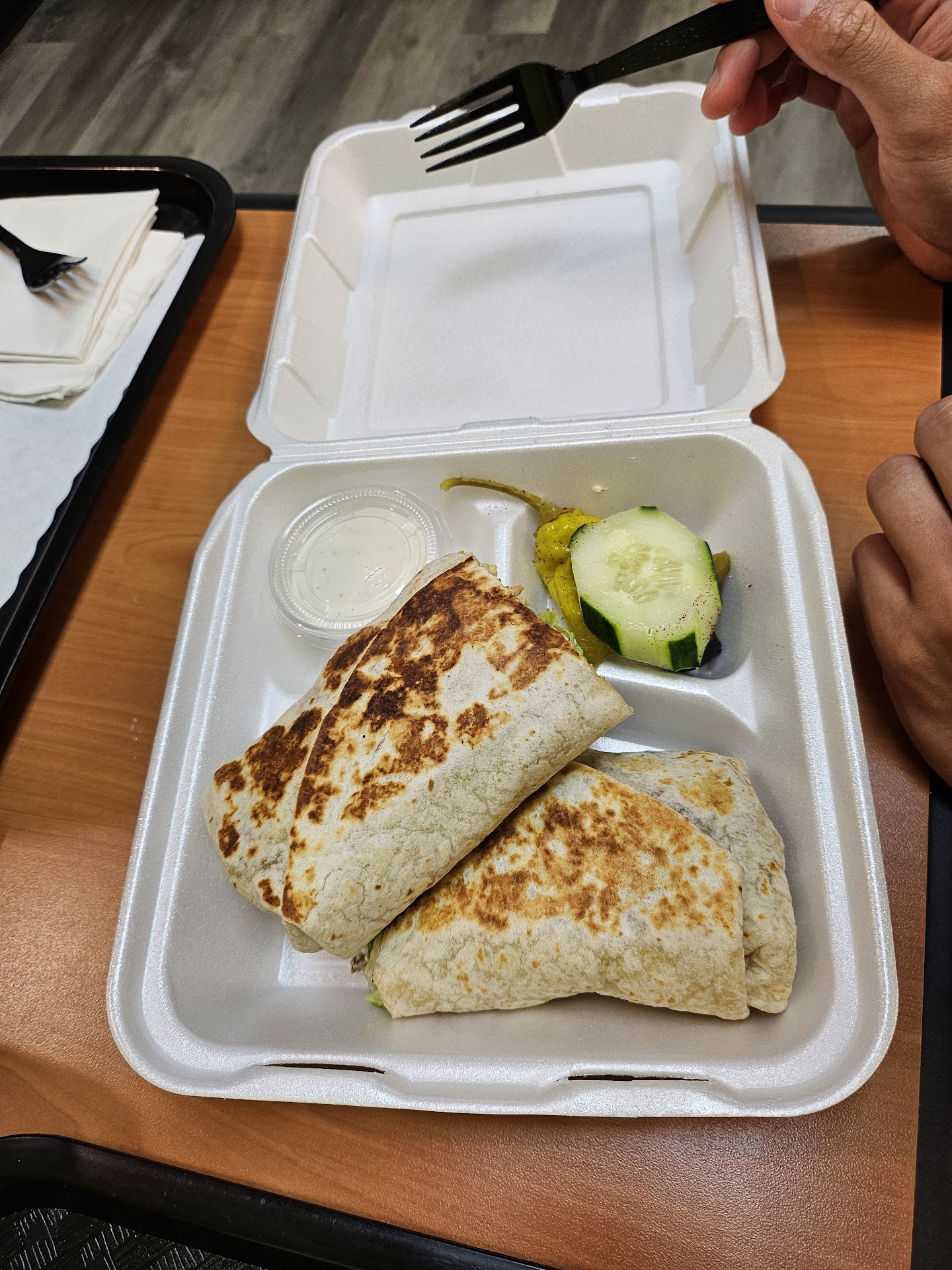 Ordered the beef and lamb shawarma and gyro wraps, the chicken shawarma wrap, and the Mediterranean falafel wrap. The shawarmas and gyros were delicious with the perfect levels of seasoning. The seasonings didn't overpower the meat, which allowed us to enjoy the full flavor profile of the wraps. The pitas used for the gyro wraps were nice and fluffy, which paired well with the hummus. The falafels and grilled veggies in the Mediterranean falafel wrap had a nice crunch, which gave wonderful texture to the wraps.