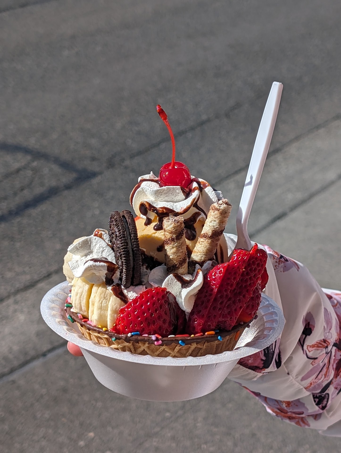 We ordered waffle cone bowl with French vanilla and pistachio ice cream, mixed fruit bowl, fruit bar and some snacks.