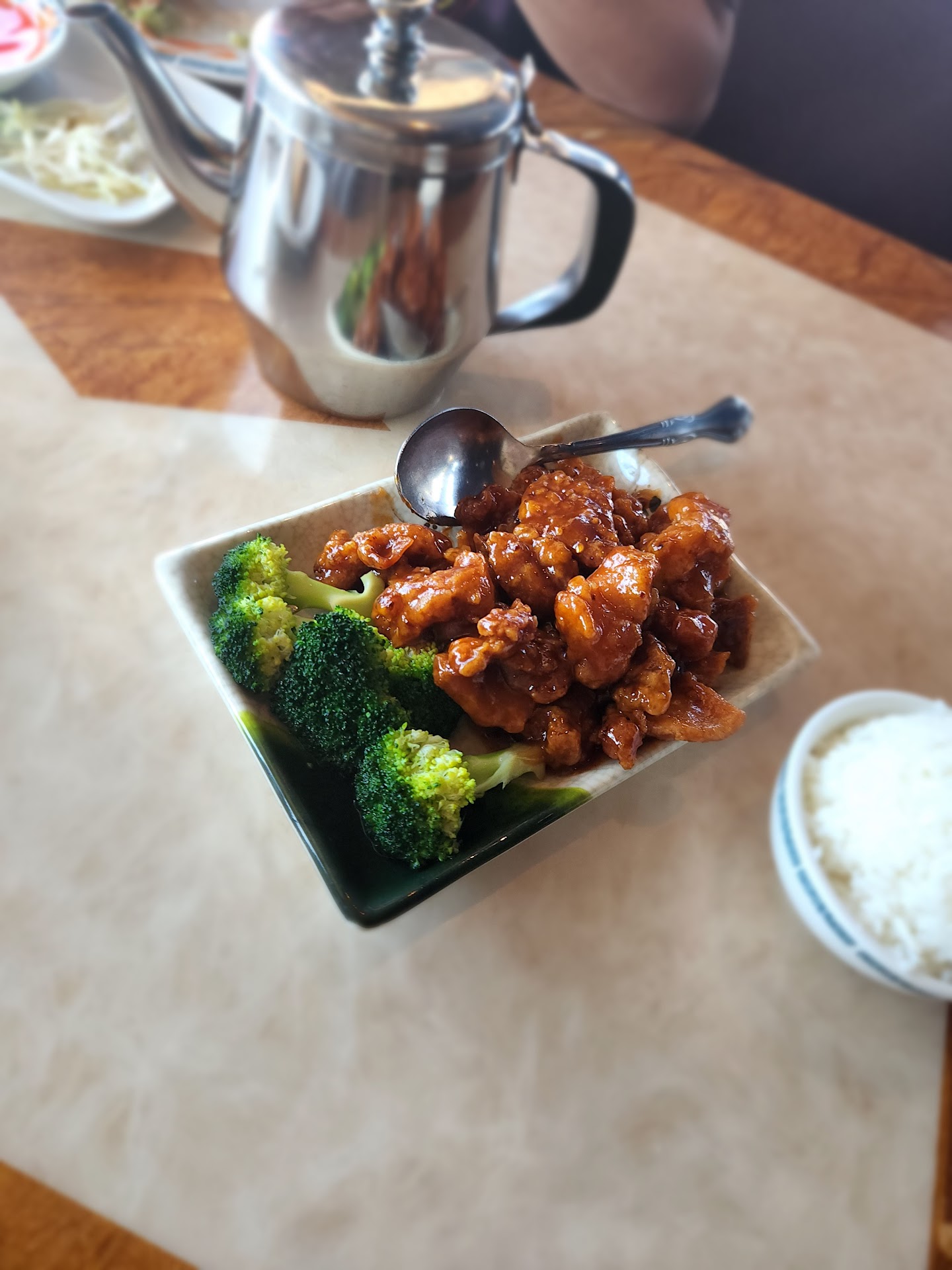 We ordered the Gen Tao's lunch combo and the No. 3 dinner. Tea was brought immediately which was nice. Our appetizer soups followed shortly after. The hot and sour soup was one of the worst I've had as it was neither hot nor sour. It seemed like all the right stuff was in it but just not enough. I am used to a little punch from my hot and sour and found this one lacking though it was full of tofu, mushrooms, etc.