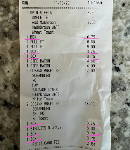 We got the bill and to no surprise it was wrong. Two items were corrected but one was not. It was indeed correct. If you really, really, really love blueberry pancakes……..you can find them here for sure. When you add 2 to your meal….they are $6.56.