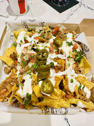 The chicken nachos were seriously some of the best nachos I have ever had! The veggies on top were fresh, and the nacho cheese had a unique and delicious flavor.