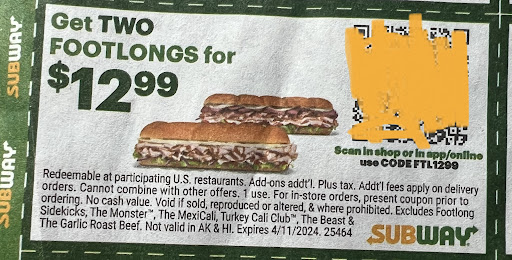 Ā Ā Ā Read moreI wish I could leave zero. I received a few coupon papers in the mail for coupons on subs. Iāve used five so far at different Subways within the Columbus/Marysville area. Never once did they question it. My buddy wanted a Chicken bacon ranch sub. The guy explained that itād be $2.50 extra for adding the bacon because they have to charge it as a grilled chicken sandwich. How does that make sense? #20 is a made to order chicken bacon ranch sub, so why up charge for bacon? I got the supreme meats. Right away I was told, āThat sub does not work for this couponā. Let me remind you, Iāve got this exact sub 5 times with this particular coupon, no questions asked. We showed him the coupon saying that sub is NOT on the excluded list! He allowed it, but I havenāt opened my sandwich yet and Iām assuming thereās no double cheese like there should be. Itās probably because, āItād be an extra $6.25 to add itā. Lol there is no way I step back...