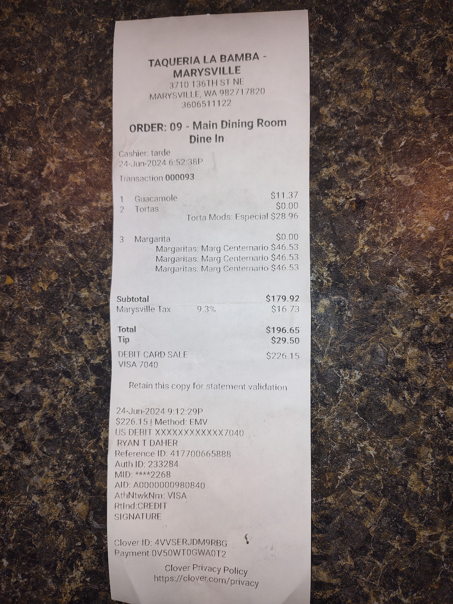 Read moreI went in for lunch, and to work on a project on my laptop. The people working acted like I was out of place for asking what the wifi password is, I asked 3 different people two or more times each and got the same “one second I’ll be right back with that” answer repeatedly. On top of that, the food was greasy/poorly prepared, and the margarita was even worse. Owners of La Bamba- Please go down the street a few miles to La Hacienda to see how they make their margaritas, they’re amazing.