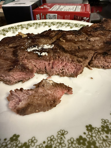 My husband said the steak with onions & mushrooms was very good; the mushrooms were not overcooked, apparently a potential issue for mushrooms. Not my thing but I will take his word for it and pass it on to his fellow mushroom lovers in the audience.