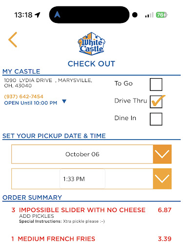 Ā Ā Ā Read moreI am not typically one to leave a bad review but this place deserves one. I had placed my order 30 mins. Before my arrival, then had to wait another 15 minutes for my order, witch wasn't even made right, causing me to be late for work. The burgers I was given were still red and cold in the middle. I do not understand how such a thin patty can be cooked so poorly. There were individuals behind the counter not in uniform, a grill operator was not wearing a hat or even a hair net. The employees were moving slow as molasses. This location did not present a clean/sanitary environment. This location does not present a good look for white castle as a company. Serious changes need made if they do wish for a good image for white castle, including retraining the staff on proper...