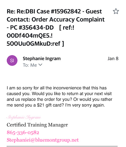 I reached out to customer service and then I heard from the Manager Stephanie via email. She asks me again what happened after I left the complaint with customer service. I explained it to her and she apologizes and gives me the option to have them replace my $20.59 order or provide me with a gift card. I said gift card and she emailed me back stating that she would get with me the next day and get it to me when she returned back. Well, I did not hear from her the next day and I emailed her to follow up and still no resolution. She did not keep her word which is very unprofessional.