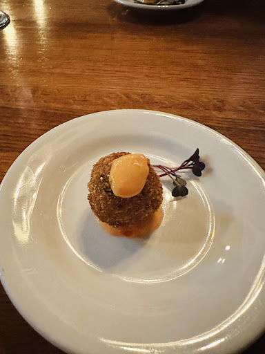 Our appetizers were very tasty though quite heavy: goat cheese tart and green fried tomatoes were seasoned well and served quickly. The seasoning on both was similar though which says something about the chef. Before the entrees, we were served a palette cleansing sorbet, which was impressive and proves that the place at least is trying for fine dining. The entrees: NY strip and duck two ways were underwhelming on many levels: first of all, far under seasoned (rosemary and garlic on beef is nice but only if combined with the correct amount of salt; the duck was blunt and the white meat part far too pink for me, I couldnât eat it; personally, Iâd suggest smoking the duck first and using more salt to eliminate any funky after flavors); also, even though I told them I donât like lukewarm food, that pink duck came out lukewarm. Secondly, heavy protein like duck or beef should be balanced out with lighter sides like fluffy potato or parsnip purĂŠe. Instead, I was served with under seasoned grits and my husbandâs beef with Mac and cheese; both were far too heavy for us. My other side: broccolini, was too hard (undercooked!). Finally, they said they have espresso but what they served us wasnât espresso; it was watered down coffee (basically Americano). I suspect that different chefs make appetizers and entrees, hence such a different experience. Also, my old fashioned was watered down or it didnât have enough liquor; itâs unusual around here, so I was a little disappointed. Overall, Iâd like to come back sometime to try some other dishes (mainly seafood), but their execution of meat wasnât as amazing as Iâd expect for almost $200 for a dinner...