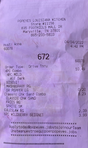 Ā Ā Ā Read moreSo, the first time my order got messed up about a week ago I thought Iād let it slide, but I just drove through and got food tonight and it is once again subpar. The first time I ordered the five tenders, Mac and cheese for the side, and a sweet tea. My roommate got the butterfly shrimp, fries, and Mac and cheese. Once we got the food, the shrimp and chicken were hard, cold, and genuinely not edible, and I was missing two tenders. Both sets of Mac and cheese were overdone and had become spongey. We didnāt get the fries despite me paying for them and neither of us got our biscuits. Tonight, I got the same order of tenders as last time and while Iām happy to say that I got all of my tenders and my biscuit, the Mac and cheese is again overdone and feels like a sponge, I also was given the wrong drink, and the chicken was undercooked in some of the thicker parts of the tenders. I donāt know whatās going on with this Popeyes because before the last few weeks the food has been great and the service has been as well, but lately itās just a massive waste of money. Chick Fil A will satisfy my craving for fried chicken for the next little...